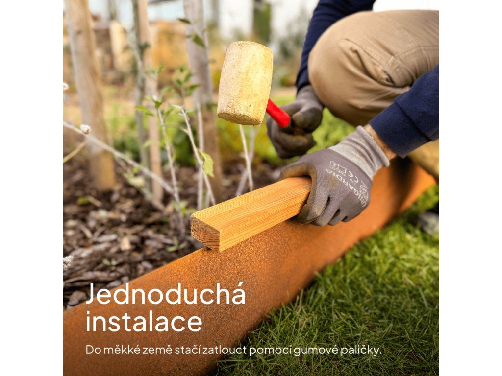Záleží na typu půdy, do které budete cortenový obrubník upevňovat. V každém případě doporučujeme půdu nejprve připravit tak, že pomocí rýče vytvoříte rýhu, do které následně obrubník vložíte. Vložený obrubník pak můžete lehce zatlouct pomocí dřevěného špalíku – špalík přiložte na horní lem obrubníku a paličkou do něj jemně poklepávejte. Upozorňujeme, že při zatloukání do tvrdé půdy bez předchozí přípravy hrozí poškození horního okraje obrubníku. Pro snadnější a pohodlnější montáž navíc ke každé sadě přibalujeme ochranné rukavice.