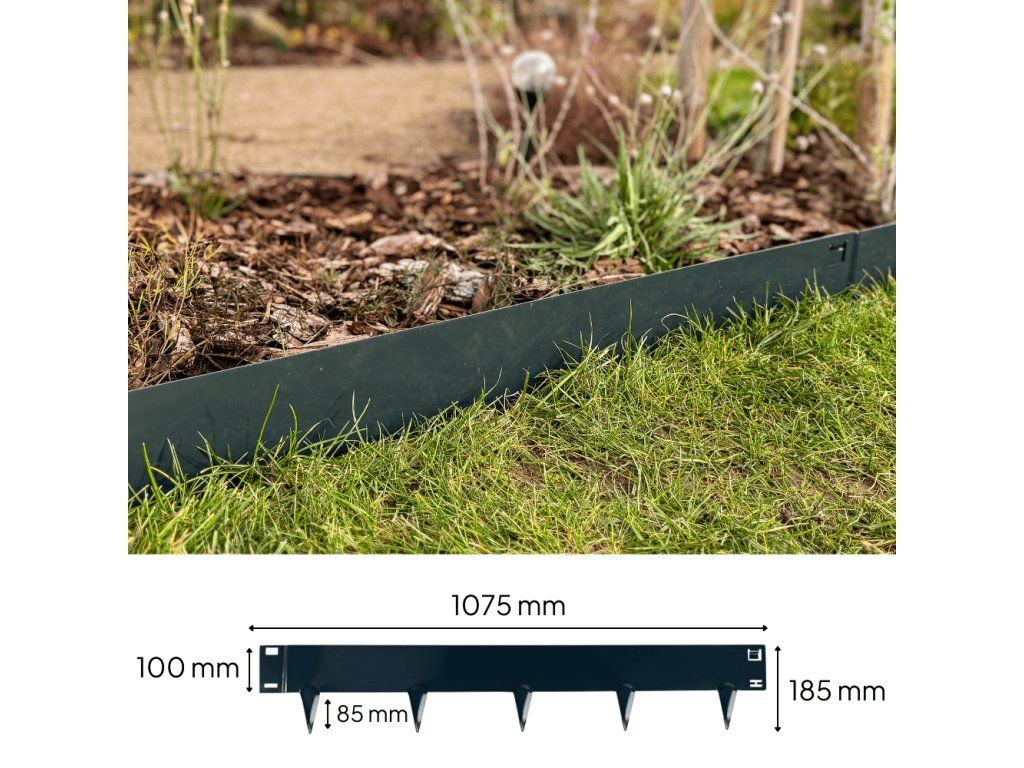 Antracitový odstín přináší nadčasovou eleganci, která se hodí do moderních i klasických zahradních úprav. Obrubník je vyrobený z galvanizované oceli o tloušťce 1,6 mm, která je dále ošetřena antracitovou práškovou barvou.
