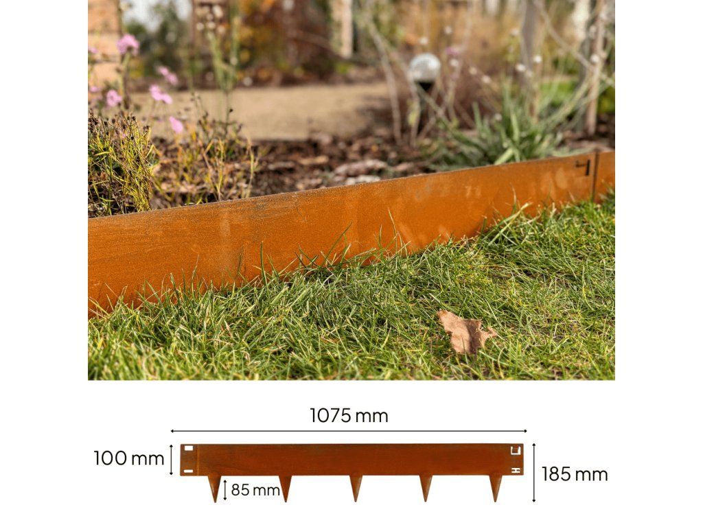Kovový 18,5 cm vysoký obrubník z kortenové oceli s praktickými hroty je rychlé a elegantní řešení pro vaši zahradu. Bez kopání, bez námahy – stačí obrubník zatlouct do země a získáte pevnou, odolnou a stylovou hranu s přirozenou rezavou patinou, která časem jen zkrásní.