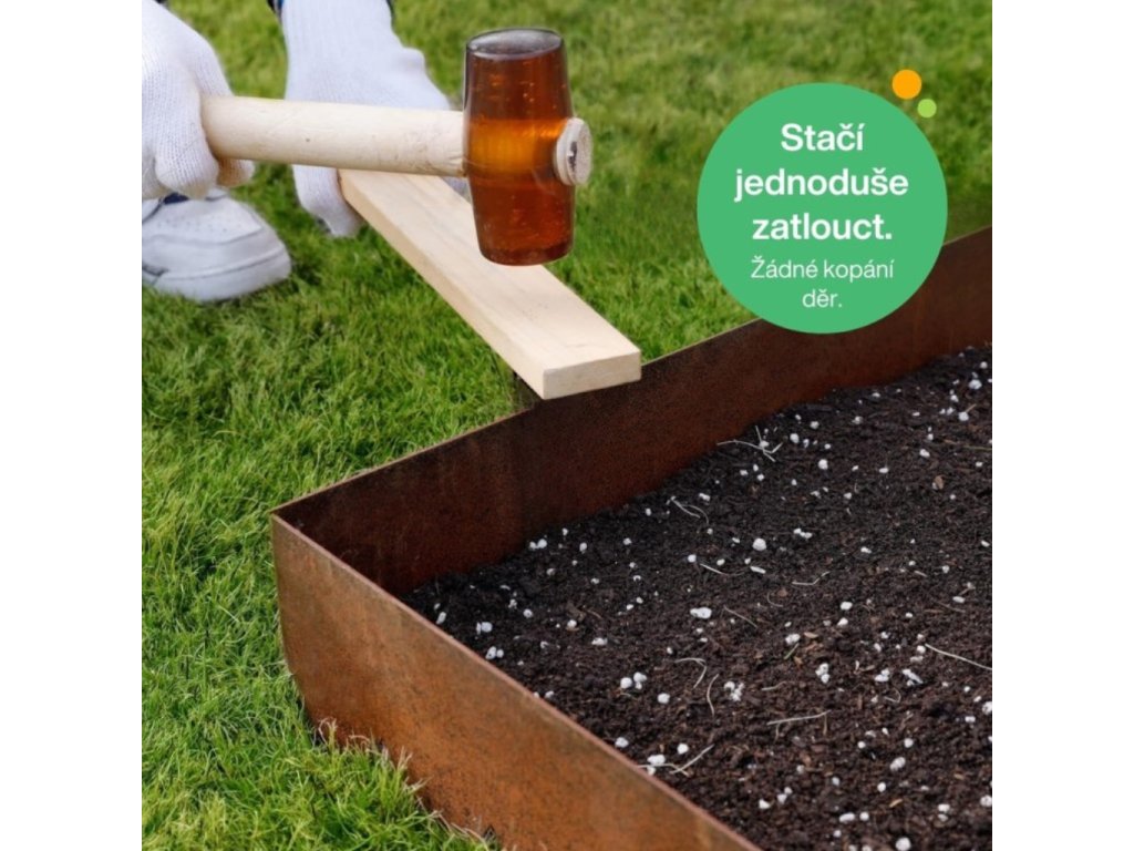 Záleží na typu půdy, do které budete cortenový obrubník upevňovat. V každém případě doporučujeme půdu nejprve připravit tak, že pomocí rýče vytvoříte rýhu, do které následně obrubník vložíte. Vložený obrubník pak můžete lehce zatlouct pomocí dřevěného špalíku – špalík přiložte na horní lem obrubníku a paličkou do něj jemně poklepávejte. Upozorňujeme, že při zatloukání do tvrdé půdy bez předchozí přípravy hrozí poškození horního okraje obrubníku. Pro snadnější a pohodlnější montáž navíc ke každé sadě přibalujeme ochranné rukavice. - Jak se obrubníky s hroty spojují?