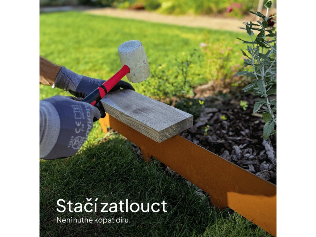 Záleží na typu půdy, do které budete cortenový obrubník upevňovat. V každém případě doporučujeme půdu nejprve připravit tak, že pomocí rýče vytvoříte rýhu, do které následně obrubník vložíte. Vložený obrubník pak můžete lehce zatlouct pomocí dřevěného špalíku – špalík přiložte na horní lem obrubníku a paličkou do něj jemně poklepávejte. Upozorňujeme, že při zatloukání do tvrdé půdy bez předchozí přípravy hrozí poškození horního okraje obrubníku. Pro snadnější a pohodlnější montáž navíc ke každé sadě přibalujeme ochranné rukavice.