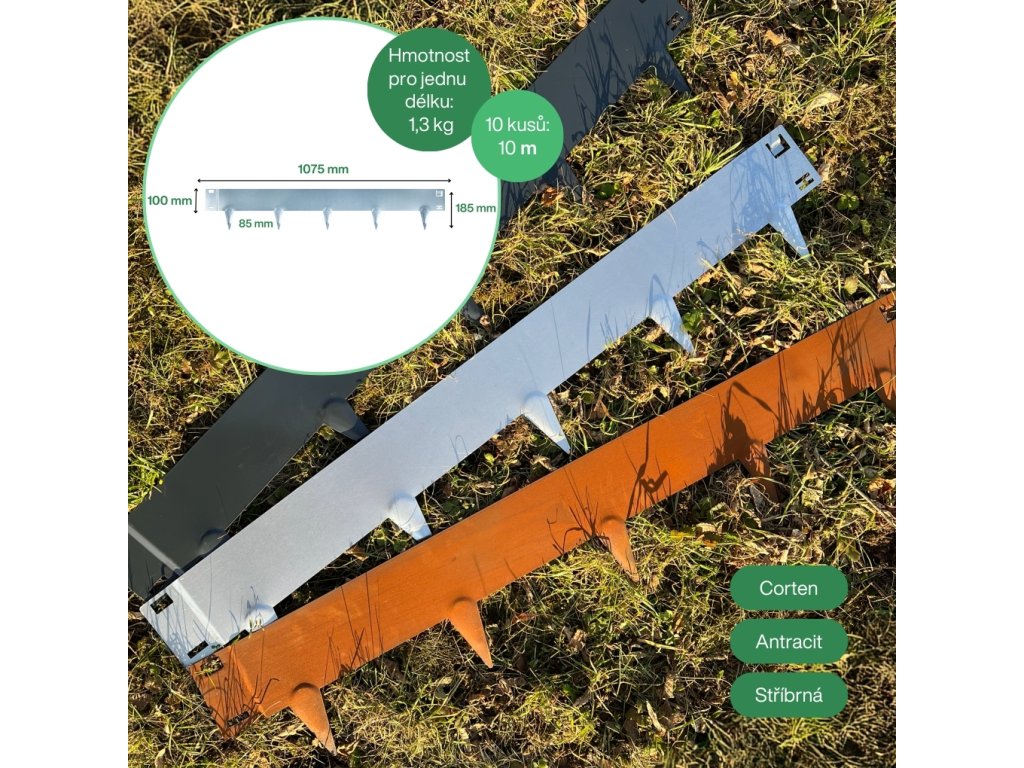 Kovový travní obrubník se špicemi - Pozinkovaný, výška 18,5 cm, délka 5-10 m (5-10 ks)