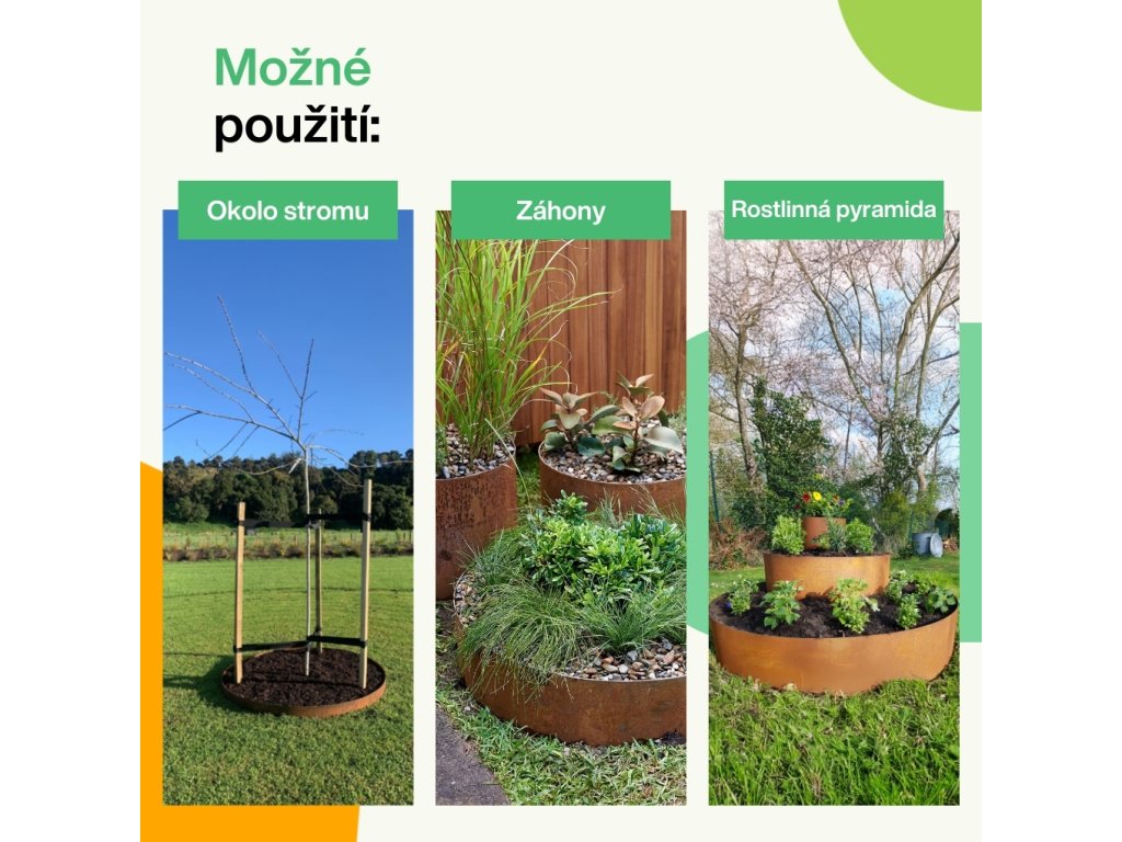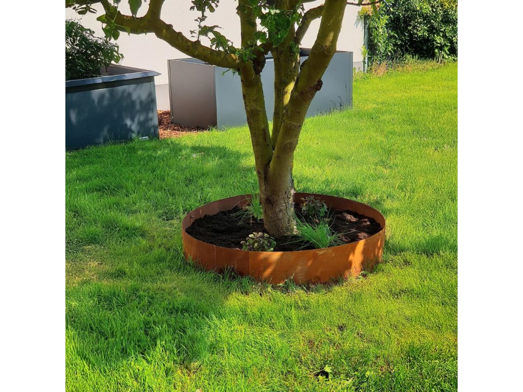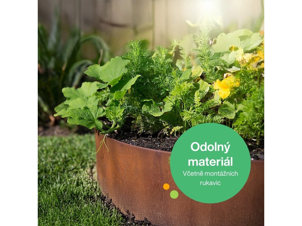 Kruhový obrubník z cortenové oceli spojuje vysokou kvalitu, odolnost a přirozený vzhled. Vyrobený z pravé cortenové oceli, není barvený, ale přirozeně reaguje na povětrnostní vlivy a časem získává svoji dekorativní rezavou patinu. Dostupný ve variantách o průměru 40 cm, 70cm a 100 cm.