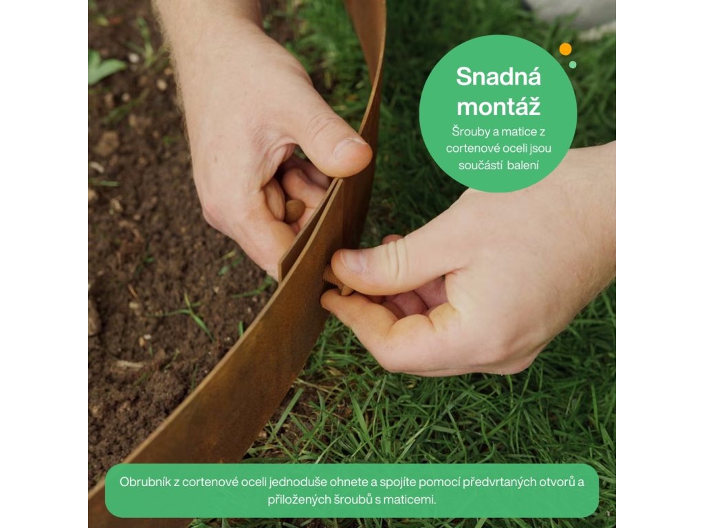 Součástí balení jsou šrouby a matice z cortenové oceli pro jednotný vzhled. Kruh se dodává ve dvou částech, které snadno spojíte pomocí dodaných šroubů. V balení najdete také montážní rukavice.