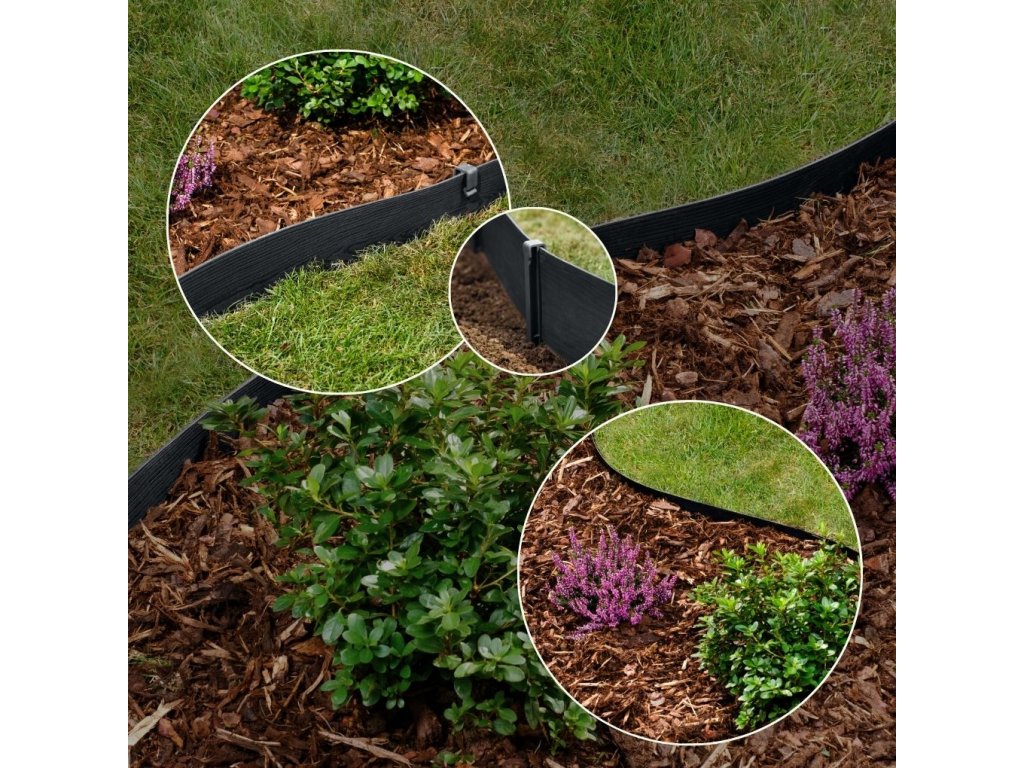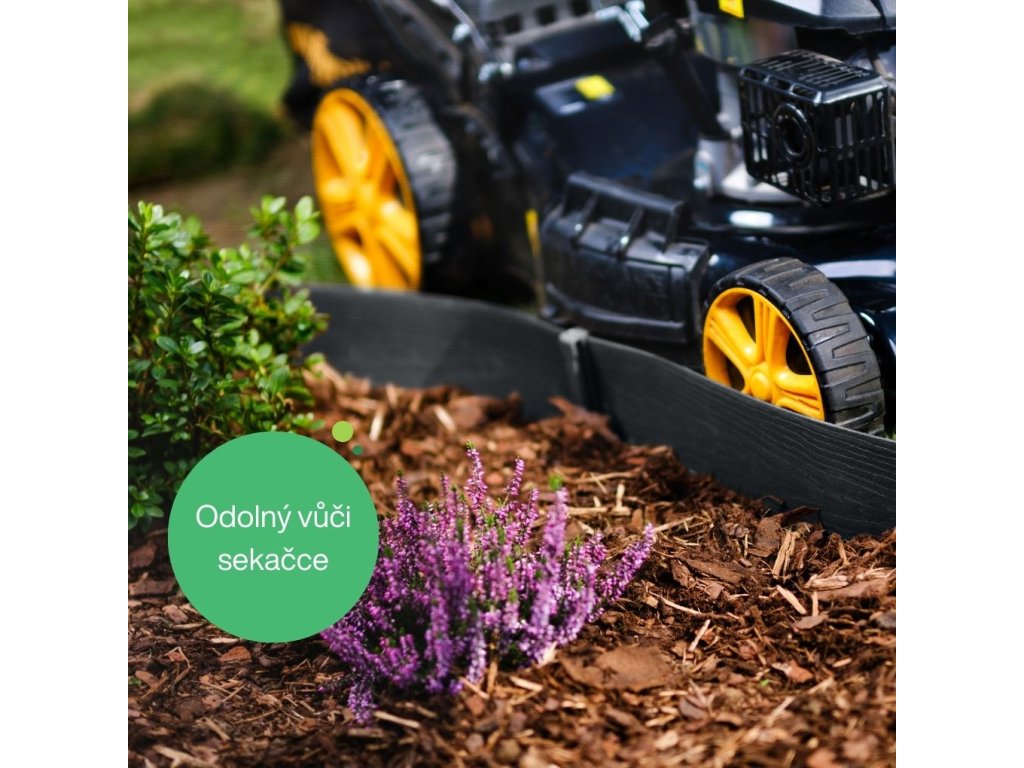 Obrubník v dřevěném dekoru a elegantní černé barvě se přirozeně začlení k záhonům i trávníku a opticky sjednotí celkový vzhled zahrady. Ideální pro ty, kdo hledají esteticky čisté řešení bez kompromisů.
