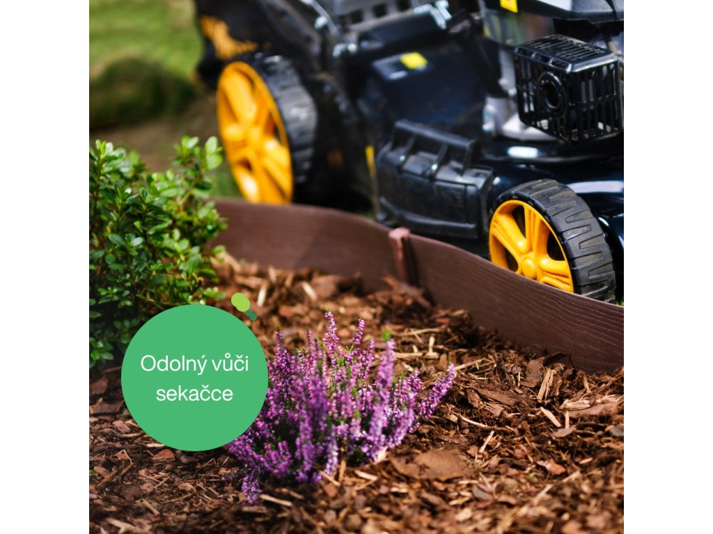 Obrubník v dřevěném dekoru a elegantní černé barvě se přirozeně začlení k záhonům i trávníku a opticky sjednotí celkový vzhled zahrady. Ideální pro ty, kdo hledají esteticky čisté řešení bez kompromisů.