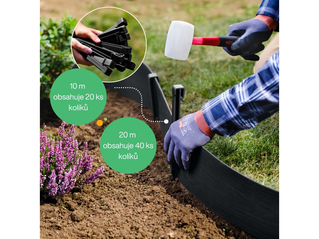 Lze jej použít jako viditelné lemování s pomocí kolíků, nebo jej částečně zapustit do země. Kolíky jsou součástí balení.