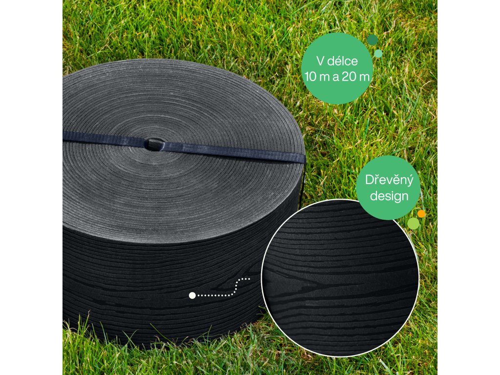 Zahradní obrubník DECOR v roli s dekorem dřeva spojuje funkčnost, estetiku a dlouhou životnost. Realistický vzhled dřeva doplněný elegantní černou barvou se přirozeně začlení do každé zahrady. Díky vysoké flexibilitě a jednoduché instalaci je ideální volbou pro milovníky upraveného vzhledu i praktičnosti. Dostupný ve dvou variantách – 10 m + 20 ks kolíků a 20 m + 40 ks kolíků.