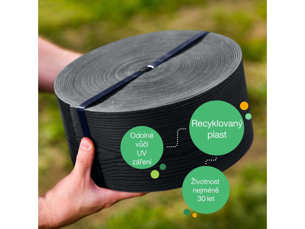 Vyroben ze 100 % recyklovaného plastu, je odolný vůči UV záření a extrémním povětrnostním podmínkám. Nerozpraská se, nevybledne a vydrží funkční i esteticky dlouhé roky.