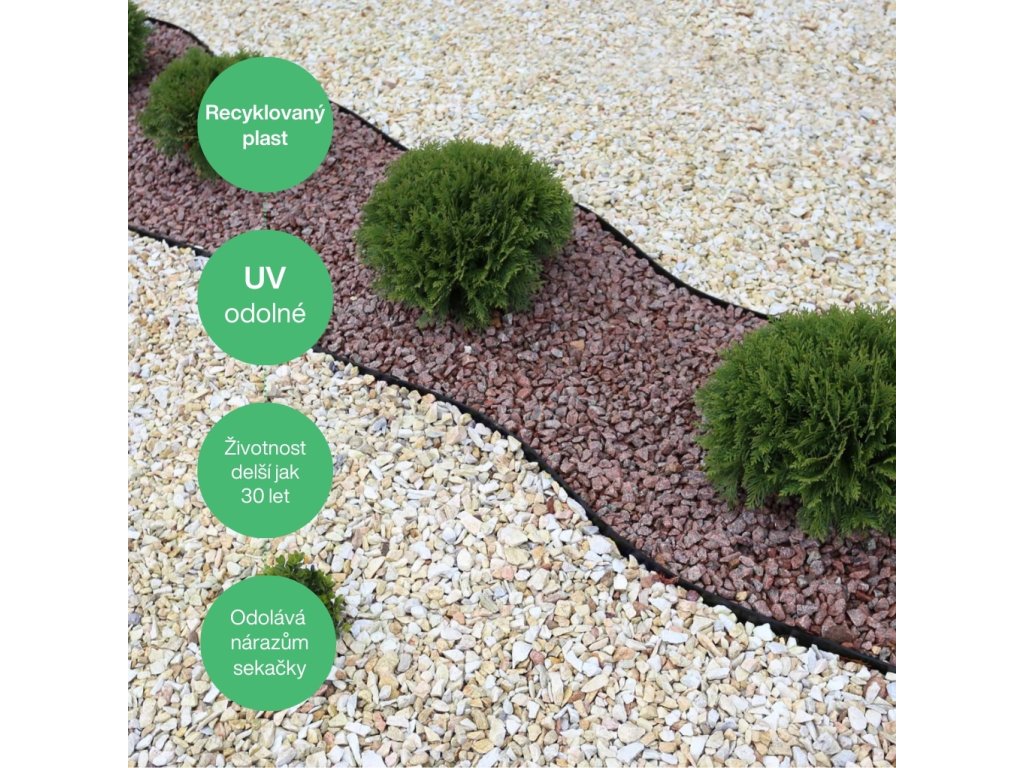 Obrubník je UV stabilní, voděodolný a odolává mrazu, slunci i mechanickému poškození od strunových sekaček nebo rotačních nožů. Zároveň účinně brání prorůstání trávníku do záhonů. Životnost až 30 let.