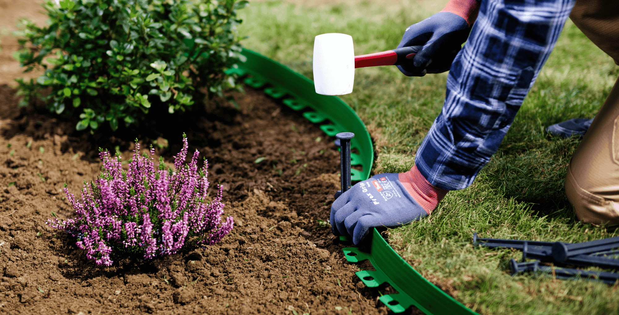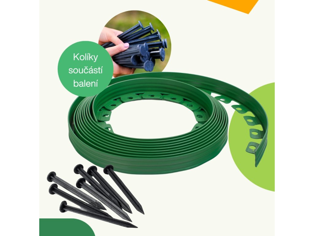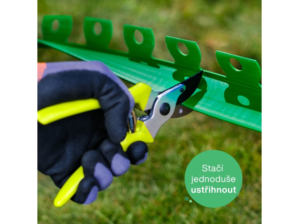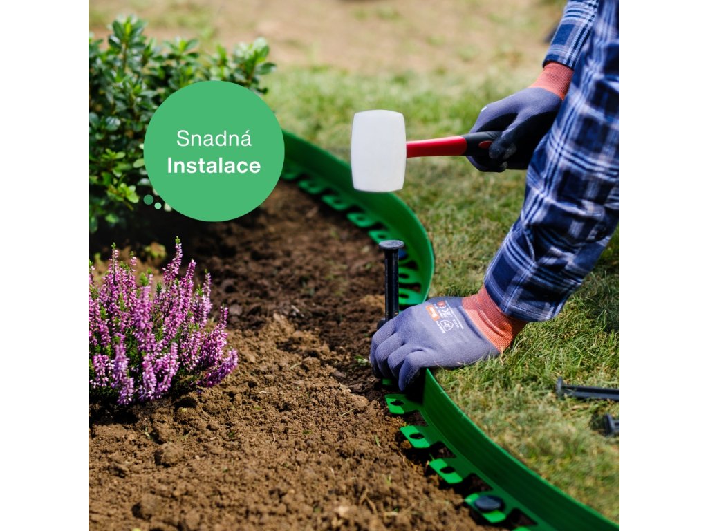 Obrubník lehce zapíchnete do země, bez složité montáže nebo kopání. Lehký plastový materiál se snadno manipuluje a instalaci zvládne každý – i bez zahradnických zkušeností.