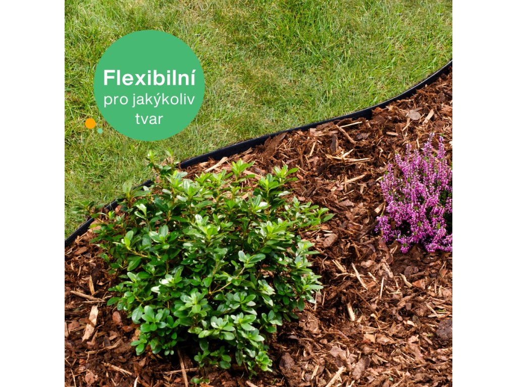 Zapomeňte na pevné dílce – role o délce 10 m vám umožní nastříhat si přesně takové délky, jaké potřebujete. Obrubník je ohebný a přizpůsobí se jak rovným, tak zakřiveným liniím.