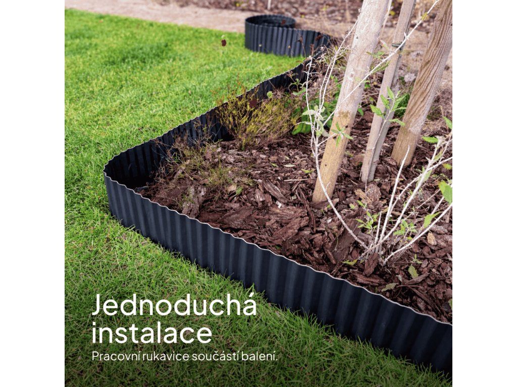 Vlnitý tvar dodává obrubníku vyšší strukturální pevnost. Díky tomu lépe odolává tlaku půdy nebo mulče a drží tvar i v náročnějších podmínkách.